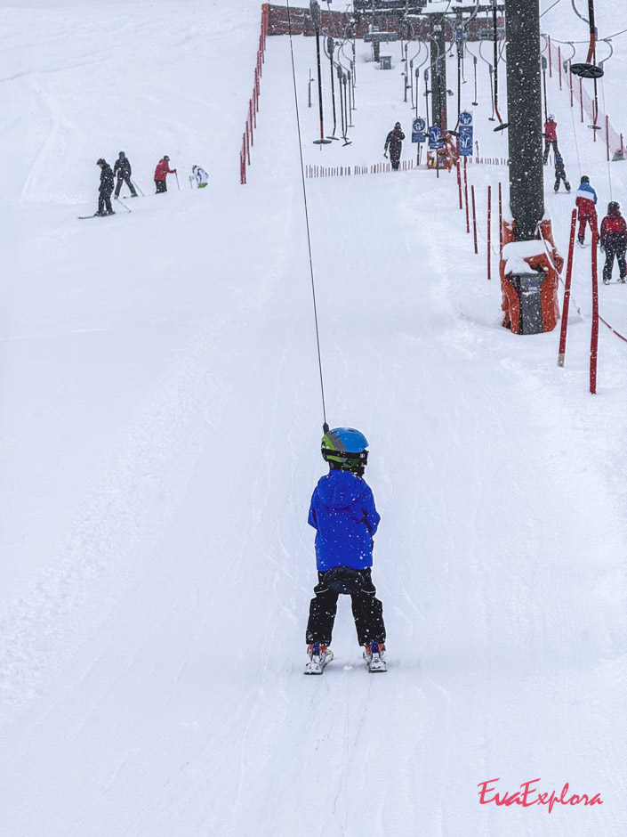 Am nächsten Tag sind wir mit beiden direkt nebenan zum Tellerlift Oberschwarzach. Ein relativ flach abfallender Hang, perfekt zum Üben. Dort sind zwei Tellerlifte direkt nebeneinander, welchen ihr nehmt, macht keinen Unterschied und dadurch geht es super schnell. Habt ihr einen eigenen Skipass, fahren die Kinder übrigens kostenlos (bis Jahrgang 2019) und bekommen ihre eigene Karte.